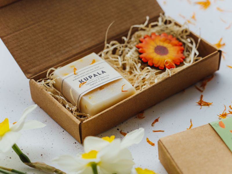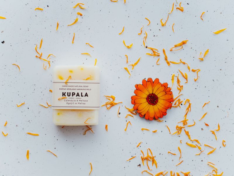 Bodi v cvetju z dišečim naravnim trdim milom Ognjič in melisa ter prikupno ročno izdelano leseno broško Ognjič izpod rok ustvarjalke Kupipi Unique.